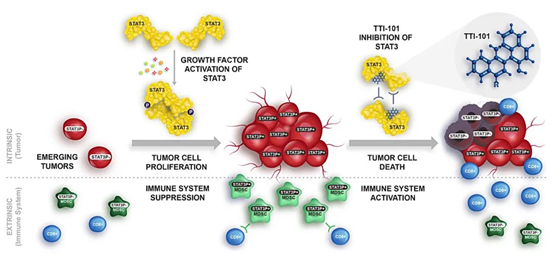 TTI-101正在進行對所有治療均失敗的晚期實體瘤患者的首次人體1期臨床試驗。截至目前,TTI-101單藥療法顯示出了良好的耐受性,并且在廣泛的腫瘤中具有臨床活性,包括多種持久的放射學上的客觀緩解。